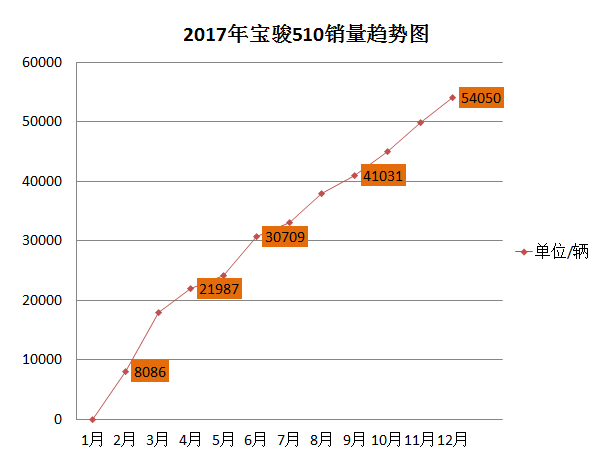 宝骏510作为上汽通用五菱全面推进年轻化战略的一款核心车型,在不到一年的时间内收获了众多年轻用户的青睐。2017年2月20日上市,10天内销量超过8000台;上市30天,销量突破20000辆;截止到2017年12月底,宝骏510全年总销量达到363,949辆,实现月销量10连涨,12月销量更是突破50000辆,在竞争趋于白热化的SUV市场中,将众多实力强劲的竞争对手甩在身后。