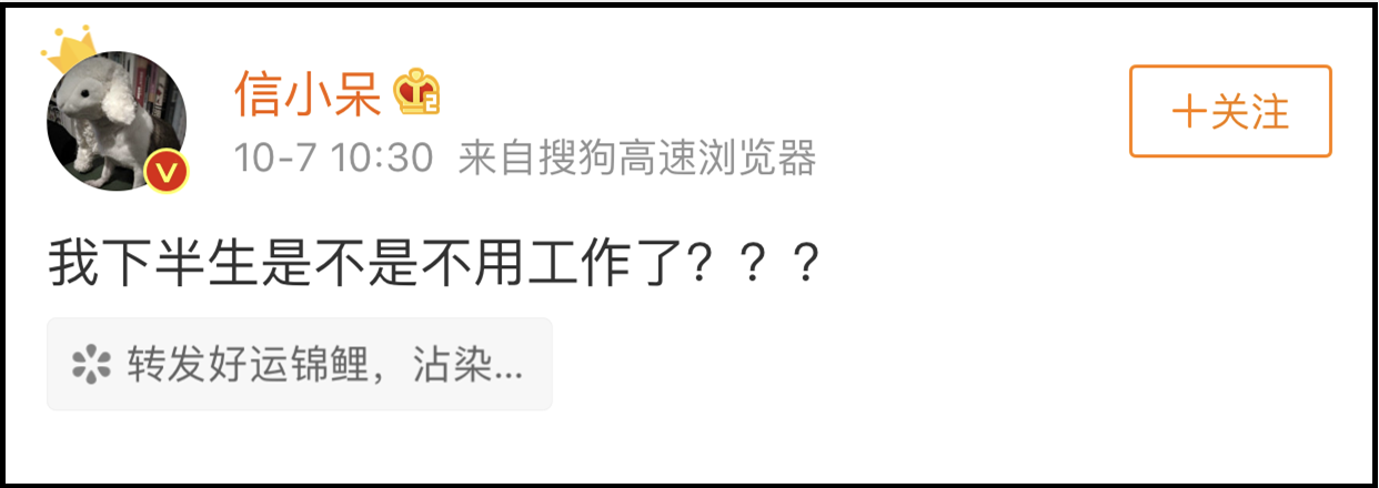 【华中汽车网报道】自从“下辈子不用工作”的信小呆等锦鲤现身以来,全民掀起了转发锦鲤的热潮,希望锦鲤保佑考试全过、天降桃花、升职加薪、一夜暴富...然而认真算算,在这条某宝发布的抽奖微博中,光看完奖品清单就得花3分钟,中奖的概率估摸是1/3000000,约等于不可能。