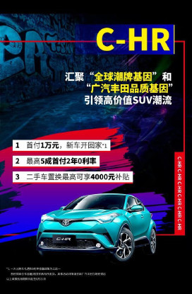 尤为重要的是,广汽丰田C-HR推出了包括首付1万元,新车开回家、最高5成首付2年0利率等多种优惠购车金融政策(*1. 一万元购车礼遇和0利率金融政策为二选一),并且推出最高4000元的置换礼,降低年轻人的购车门槛。