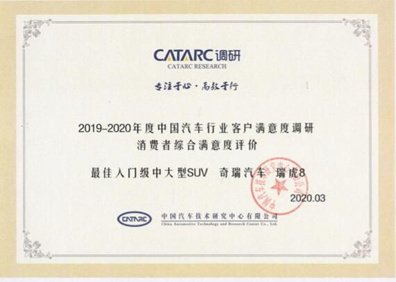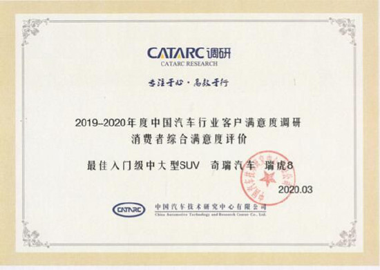 【华中汽车网报道】近日,中国汽车技术研究中心发布了2019-2020年度中国汽车行业客户满意度调研结果,奇瑞旗舰SUV车型全新一代瑞虎8凭借出色的产品实力和服务,荣膺“最佳入门级中大型SUV”称号。这也标志着,随着产品力和服务力的大幅提升,奇瑞汽车正稳步迈入高质量发展阶段。