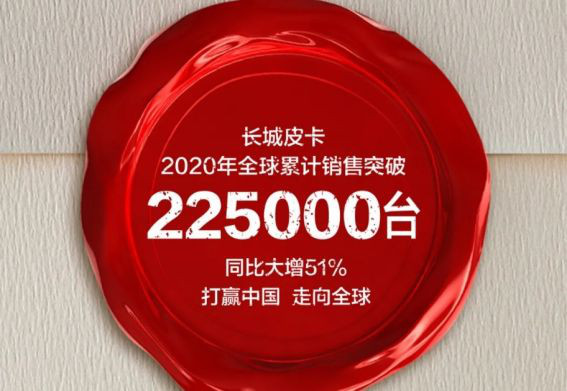 【华中汽车网报道】近日长城皮卡发布年终销量,再次让皮卡行业瞩目。数据显示,长城皮卡2020年累计销量突破22.5万辆,同比增长51.2%,市占率近50%,已连续23年获得国内、出口销量第一,全球累计用户近190万。