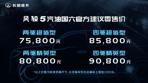 长城皮卡是中国第一家同时拥有汽、柴油国六车型的皮卡品牌。2020年更是风骏皮卡推新的产品大年,2月29日,风骏5汽油版国六和风骏7新冠军版上市,实现经典车型再度升级,性价比全面提升。
