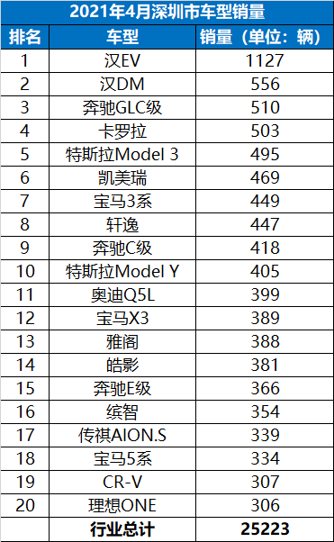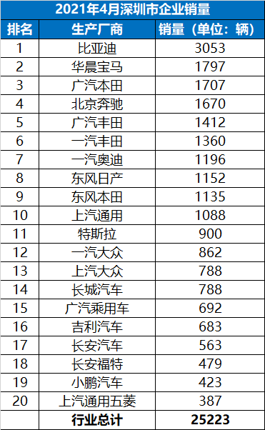 2021年4月深圳市企业销量和车型销量