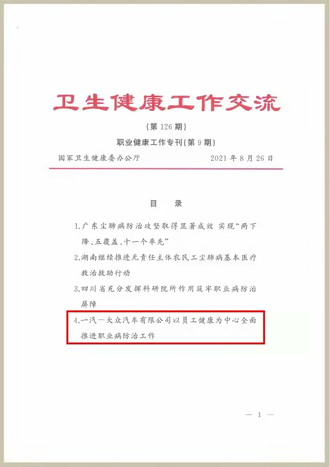 【华中汽车网报道】近日,国家卫生健康委办公厅印发《全国职业健康工作专刊》,将一汽-大众以员工健康为中心全面推进职业病防治工作的成功经验在全国范围内进行推广。