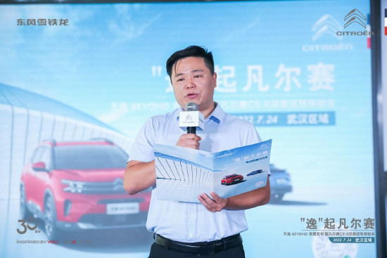 活动开场, 东风雪铁龙华中大区总监王亮亮致辞,向大家介绍道:东风雪铁龙天逸BEYOND来源于雪铁龙“勇于创新、不断突破”的品牌基因,并在客户关注的“设计、科技、舒适、驾控”四重升级,让用车生活更加舒心、从容、便捷。凡尔赛C5 X完美融合了轿车的优雅与动感、SUV的稳健和高通过性以及旅行车的实用性,既大胆又创新,并且很好的传承了雪铁龙品牌的法式调性,为客户带来更加舒适、智能的用车生活。