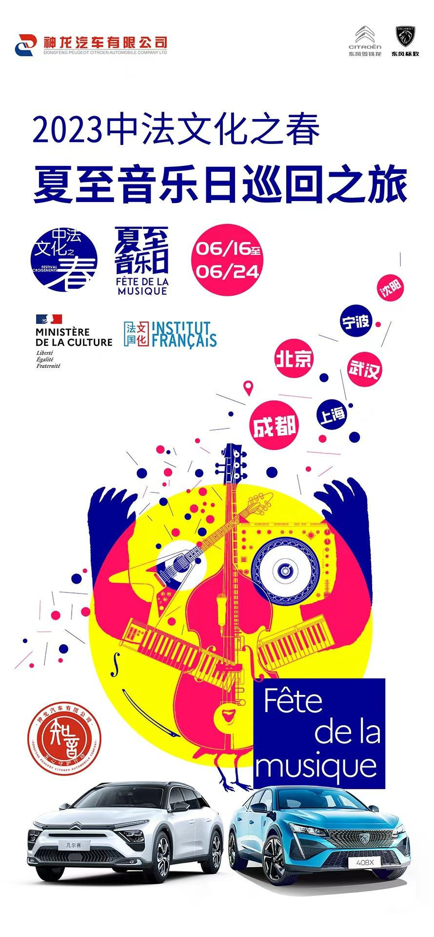 【华中汽车网报道】还有什么比热情的舞台+美好的夏日这对组合更令人期待呢?6月16日至24日,2023中法文化之春·夏至音乐日即将唱响全国六座城市,释放夏夜精彩。作为中法文化融合的促进者,神龙汽车已多年支持中法文化之春,今年东风雪铁龙、东风标致也将再次助力夏至音乐日,展示中法文化、艺术碰撞的动感、时尚魅力,寻觅更多热爱个性、时尚、优雅品味生活的“知音”。