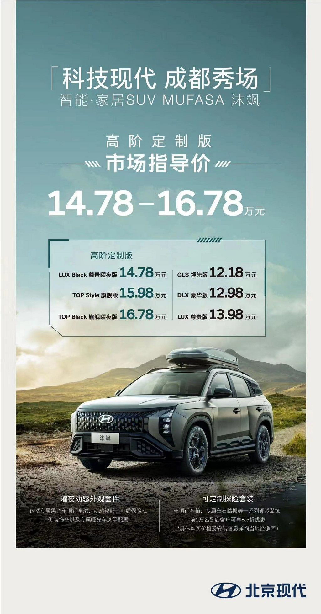 北京现代在本届车展新推出了MUFASA 沐飒高阶定制版,包括LUX Black 尊贵曜夜版14.78万元、TOP Style 旗舰版15.98万元、TOP Black 旗舰曜夜版16.78万元。