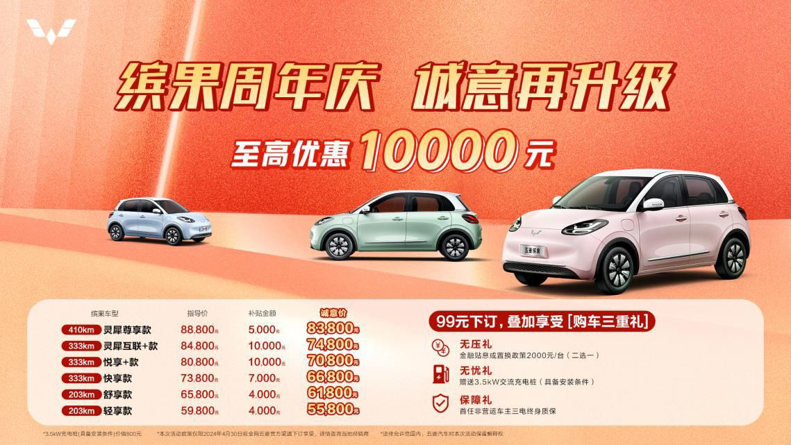 五菱缤果推出诚意价5.58万起,至高优惠10000元。具体到各车型配置:203km轻享款5.58万元,203km舒享款6.18万元,333km快享款6.68万元,333km悦享+款7.08万元,333km灵犀互联+款7.48万元,410km灵犀尊享款 8.38万元。即日起至4月30日期间,用户可通过全网五菱官方渠道99元下订五菱缤果,叠加享受购车三重礼,包括无压礼:金融贴息或置换政策2000元/台(二选一);无忧礼:赠送3.5kW交流充电桩(具备安装条件);保障礼:首任非营运车主三电终身质保。