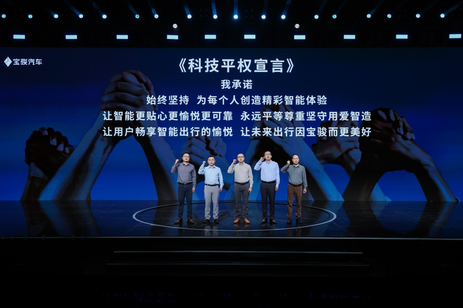 发布会现场,五位宝骏技术主理人先后登台,共同诠释宝骏技术底座。宣言环节,五位技术主理人代表宝骏汽车宣读《科技平权宣言》,共同承诺:“始终坚持为每个人创造精彩智能体验,让智能更贴心更愉悦更可靠,永远平等尊重,坚守用爱智造,让用户畅享智能出行的愉悦,让未来出行因宝骏而更美好!”