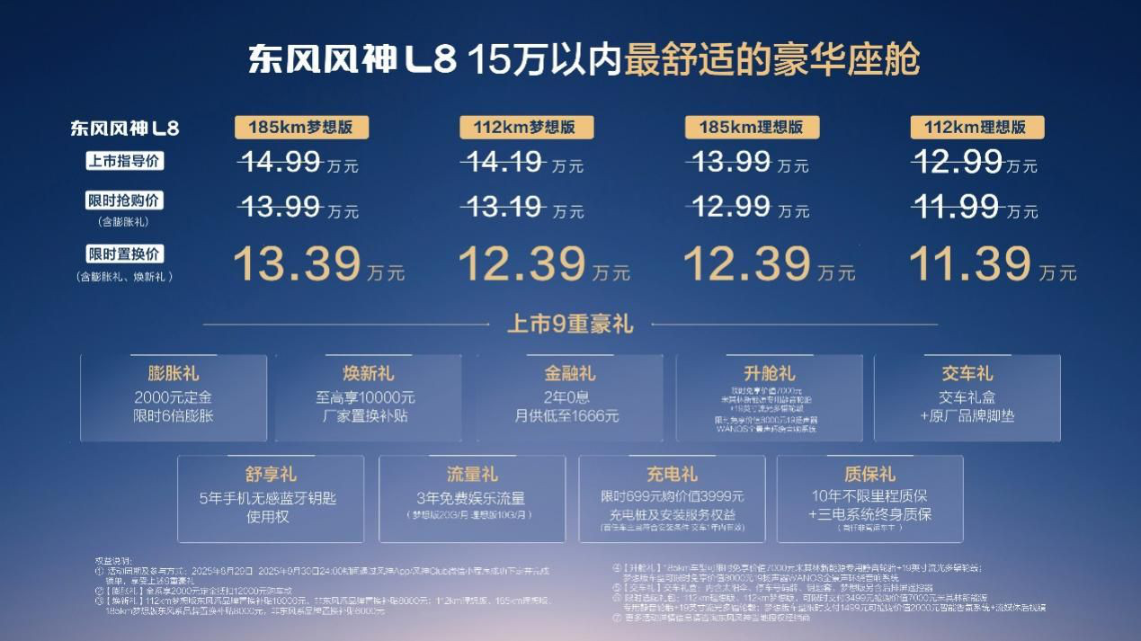 【华中汽车网报道】8月29日,在第28届成都车展上,东风新旗舰东风风神L8正式宣布上市,限时置换价仅需11.39万元起(可叠加享受国/地补),直接击穿“25万元才能配齐冰箱彩电大沙发”的行业认知,成为这个级别最具竞争力的舒享座舱之王。