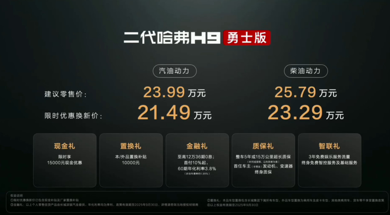 【华中汽车网报道】8月26日,第二代哈弗H9勇士版正式上市,汽油动力优惠换新价21.49万元、柴油动力23.29万元,下订可享1.5万元优惠、1万元置换补贴等多重福利,不仅精准踩中消费者对高性价比硬派越野的期待,更带着“颜值、越野、舒适”三大维度、八大升级,直接向当前市场发起冲击,哈弗这次要让“诗与远方兼得”的越野梦,不再是少数人的专属。