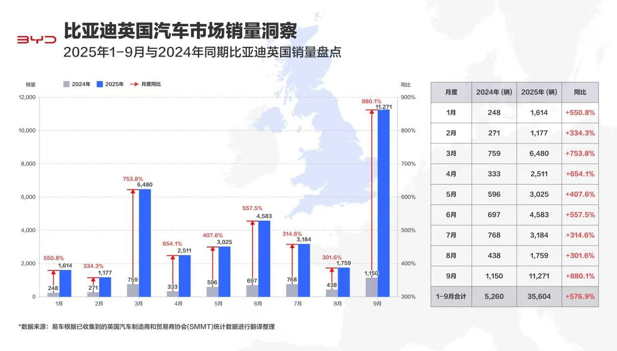 【华中汽车网报道】2025年9月,比亚迪在英国市场的乘用车销量达到了11271辆,同比增长880%,环比增长541%。今年前九个月,比亚迪汽车在英累计销量达到35604辆,同比增长576.9%,全市场销量超越了特斯拉、Mini等一众知名汽车品牌同期在英国的销量。