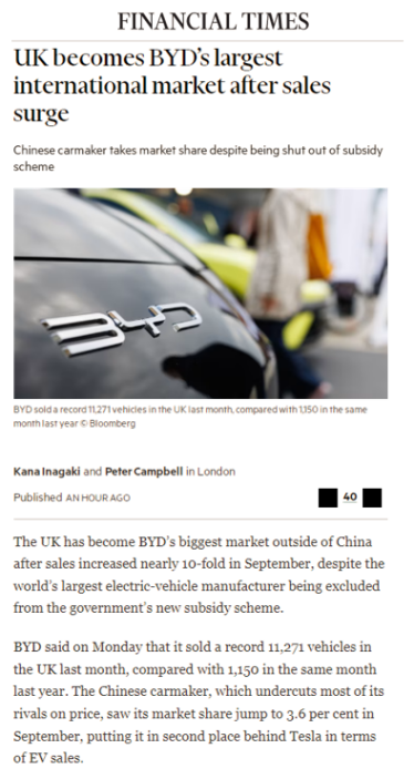 比亚迪在英国市场的高速增长,也吸引了英国主流媒体的高度关注。英国广播公司(BBC)报道“中国电动汽车巨头比亚迪9月英国销量创下新高”;《泰 晤 士 报》则以“中国新晋品牌比亚迪超越英国老牌汽车品牌”为题,指出“两年前英国几乎没人听说过比亚迪”;《金融时报》更进一步强调“英国成为比亚迪最大的国际市场”。