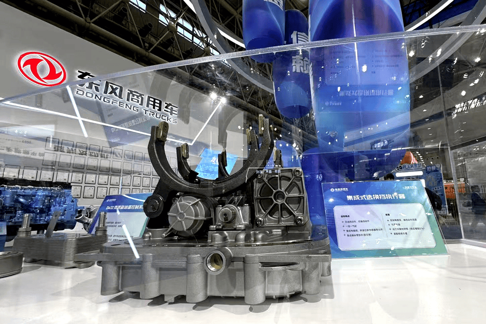 而在追求平顺与高效的传动领域,东风展出的集成式选换挡执行器同样彰显了其精妙的工程设计。该执行器采用高度集成的设计理念,其结构核心在于将电磁阀、转速位移传感器等关键元件与操纵零部件(如拨叉)融为一体,并创新性地采用单一气缸直接驱动换挡动作,实现了结构的极致精简。正是这种高度集成的物理结构,为其带来了卓越的性能表现:它不仅实现了极高的控制精度与迅捷的换挡响应,更将每次换挡的动力中断时间显著缩短(响应时间优化达0.1秒),从而确保了动力输出的连贯性与驾驶的平顺性。此外,一体化的设计也大幅提升了单元的可靠性,并为整车的装配与后期检修维护带来了极大的便利。
