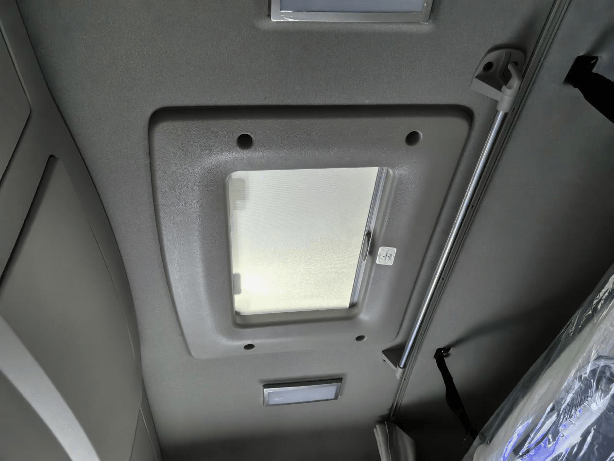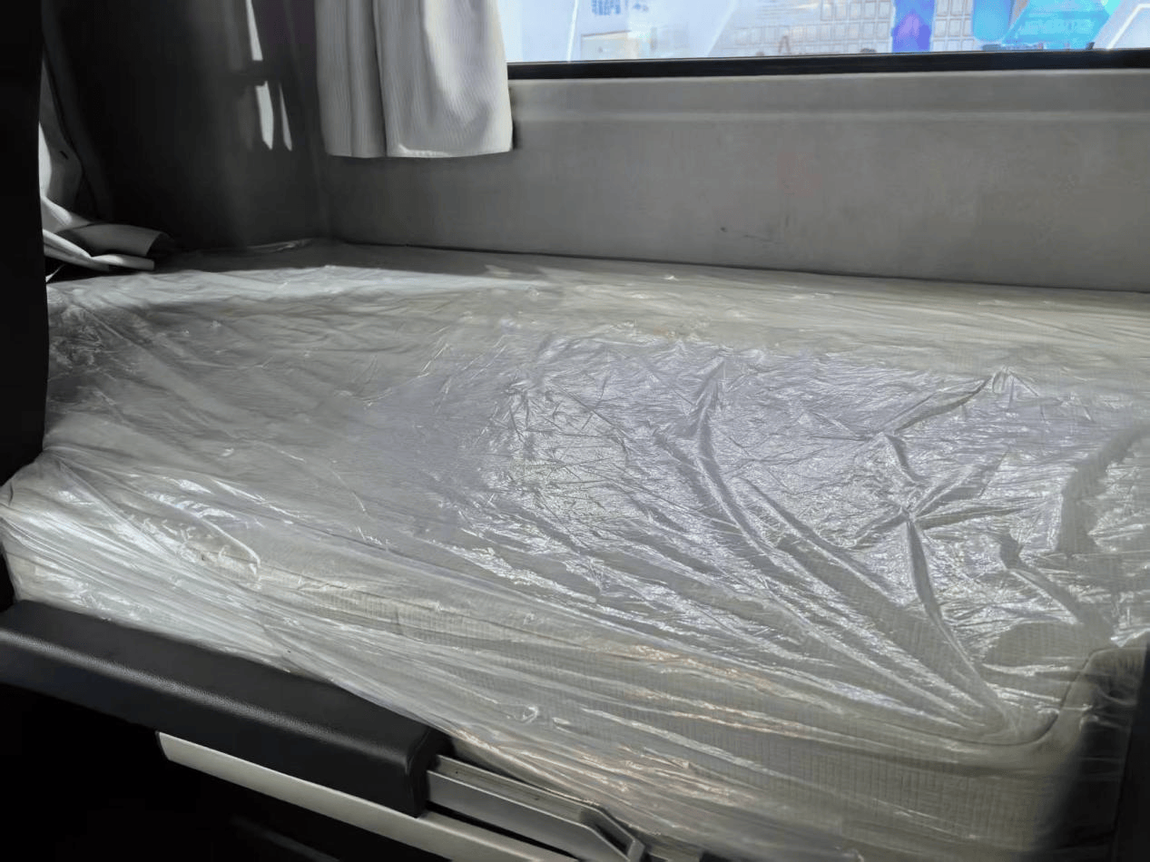 驾驶室站立高度近2米,即使是身高1.8米开外的驾驶员,在车内活动也不会感到局促。卧铺宽度达880mm,厚度100mm,采用高回弹海绵材质,长途运输间隙能提供舒适的休息环境,有效缓解驾驶疲劳。