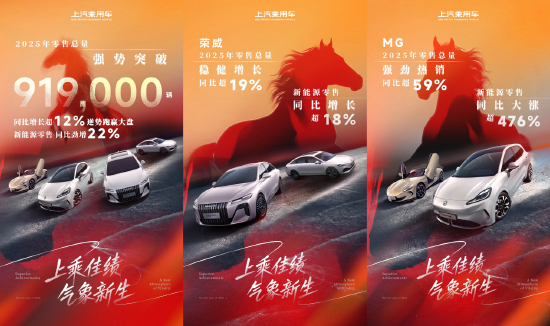 【华中汽车网报道】2025年,上汽乘用车全年零售总量强势突破91.9万辆,同比增长超12%,其中,新能源零售同比增长22%,增长势头强劲。荣威零售总量同比稳健增长超19%,新能源零售同比增长超18%;MG零售总量同比劲增超59%,新能源零售同比大涨超476%。这不仅是销量规模的增长,更是上汽乘用车在品牌产品焕新、技术体验平权、渠道服务升级等维度推动“全面To C”转型,并获得市场认可的明确信号。