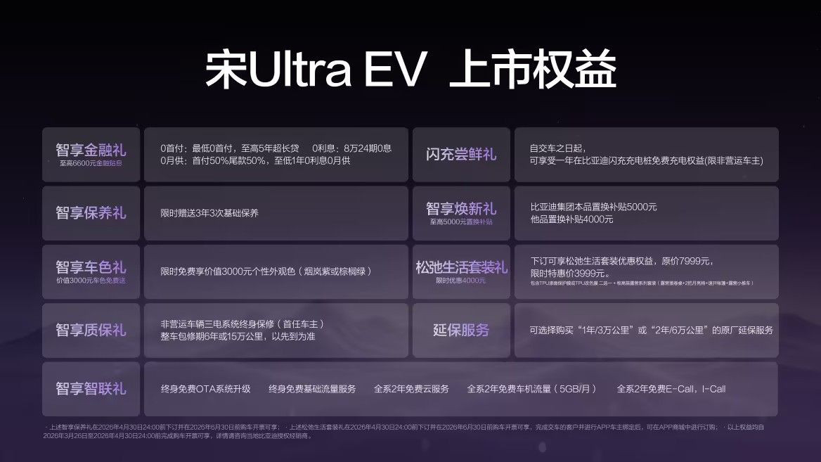 宋Ultra EV全系标配超100项实用配置,包括第二代刀片电池及闪充技术、主副驾座椅记忆、带遮阳帘的全景天幕、电动后尾门、15.6寸大屏、前备箱电动解锁、前排远端气囊、螺纹接口等,入门即满配,绝对是2026年最值得入手的SUV。
