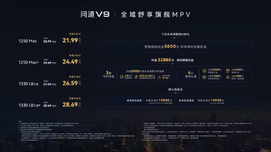 4月28日,这款承载“高端平权”使命的旗舰车型正式开启预售,预售补贴价为21.99万元-28.69万元,轻松解锁十大旗舰配置。值得注意的是,即日起下定问道V9,用户可享包含“三电系统终身质保、8年或15万公里电池衰减超限值只换不修、电池自燃烧一赔一”的3重守护承诺,以及价值10000元购置税补贴、价值5000元置换补贴、价值11000元用车保障权益、价值1880元先见·问道礼的四大尊享礼遇,限时预售权益总价值至高32880元,让消费者无需为产品溢价买单,直接坐拥全域舒享的豪华出行体验。