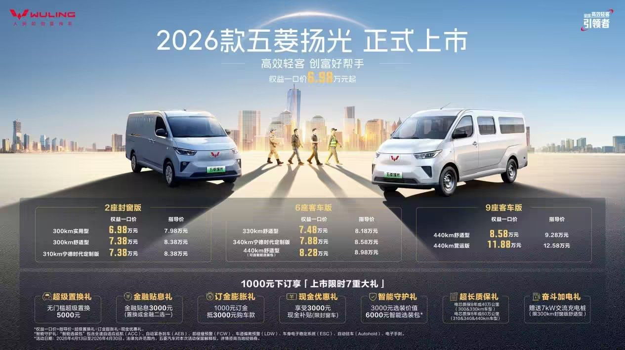 【华中汽车网报道】“高效轻客,创富好帮手”。4月13日,2026款五菱扬光通过一场高效创富场景挑战直播正式上市,限时一口价6.98万起!作为新能源轻客标杆车型,五菱扬光已连续24个月蝉联细分市场销冠,本次升级精准聚焦城配司机提升创富效率的核心需求,全新搭载基于五菱“天·灵·神”技术体系打造的三大商用车专用技术,在维持原售价的基础上,实现“续航加码”、“动力加码”、“智能加码”、“空间大码”的全方位升级。以“只加码,不加价”的诚意助力司机开启高效创富新一程;更用硬核技术定义高效轻客新标准,持续引领行业良性发展。